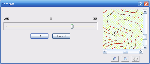 Moving the slider to the right makes all the light pixels lighter and the dark pixels darker - the image gets more intense. Moving the slider to the left makes the image less intense, resulting in a uniform mid grey at the extreme left. The preview image shows the effect as you drag the slider back and forth. Pressing the OK button will perform the change on your image.