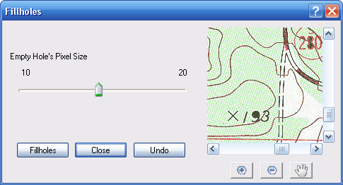This options scans the raster for background intensity pixels surrounded by dark pixels. Holes up to the size specified by the slider get filled in with dark pixels.