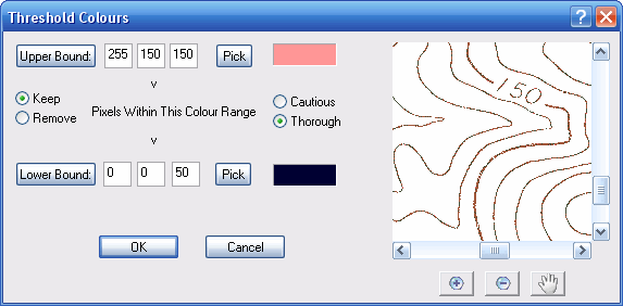 Selecting this option brings up a window which allows you to remove pixels from the raster which are above or below the threshold colour limits.